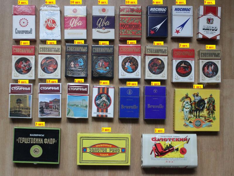 Фото сейчас сделать нет возможности, вот что есть в наличии: СК - 13 шт., Ватра - 24 шт., Прима - 2, Феникс - 1, Интер - 1, Фильтр - 1, Полёт - 1. Это всё запечатанные пачки в идеальном состоянии, хранились в сухом шкафу и их ещё можно курить. . Есть ещё пустая пачка из под Космоса. |