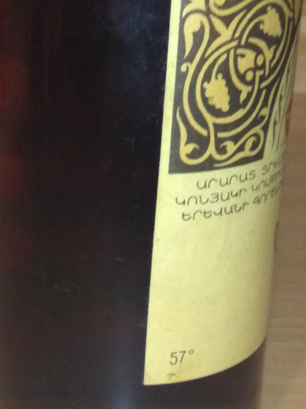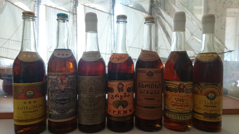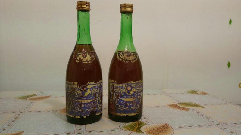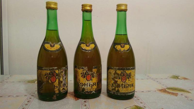 При ревизии дедушкиной коллекции спиртного обнаружены следующие экземпляры: грузинский коньяк "Энисели" 1983 и 1989 года, армянский коньяк "Арарат" 1984 года, молдавский - "Дачия-Феникс" (Белый аист") 1990 года.