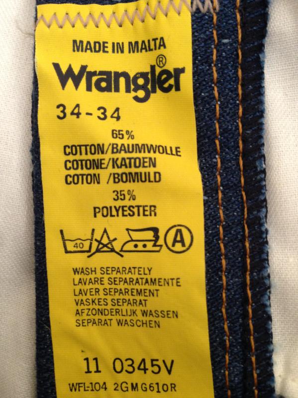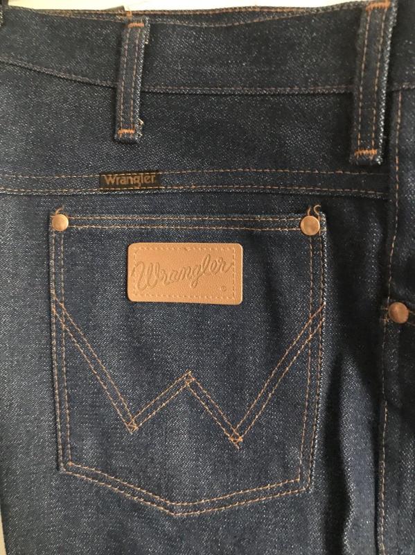 189. Абсолютно новые легендарные мальтийские мужские джинсы Wrangler, модель 110345V, сделаны в середине 80-х, Wrangler Blue label(синяя этикетка), тяжелый blended cotton, 14OZ, молния Eclair, колокол на заклепках, клепаный малый карман, номерная пуговица, кожаный патч. Старые запасы - made in Malta.