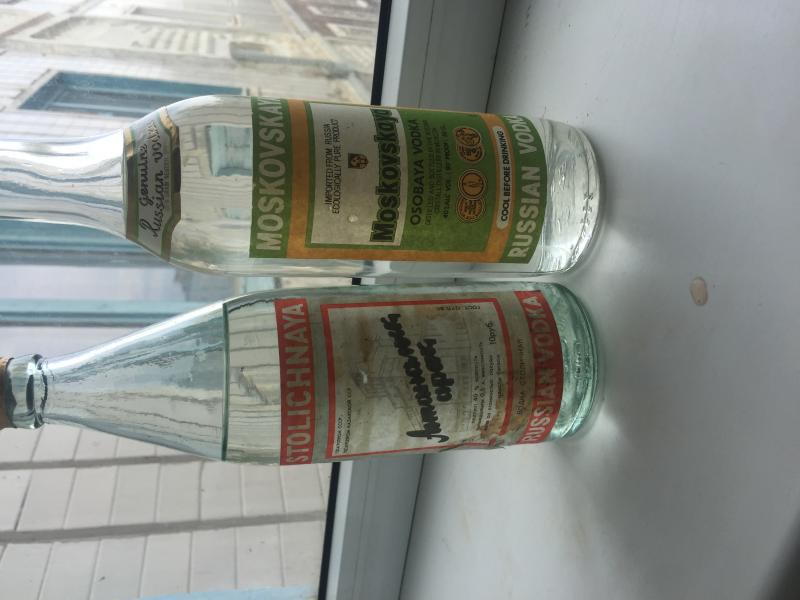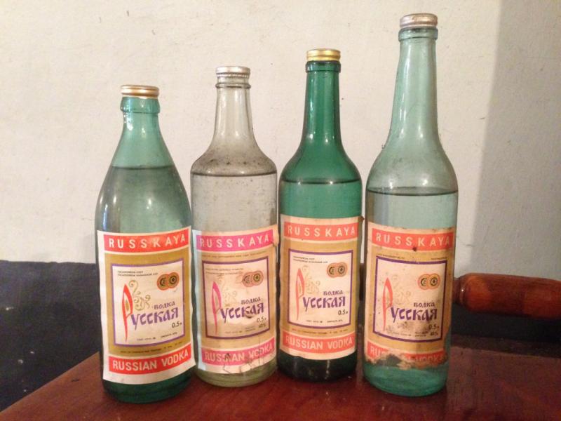 Водка русская и пшеничная в разных по форме бутылках разных годов, коньяк азербайджанский и грузинский, виски John Ваrr, ликер Amaretto, бренди Napoleon.