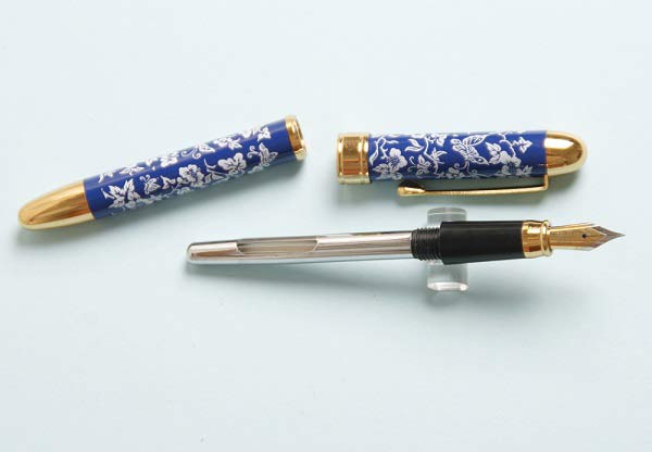 Редкая перьевая ручка Golden Star (Jinxing, КинСин) в керамическом корпусе. Производство Китай, 1980е годы. Открытое перо - сталь с иридиевым наконечником, заправка пипеткой. Корпус - металл покрытый керамикой с цветочным орнаментом. Длина в колпачке - 14см, без колпачка - 12,4см, толщина 1,2см, вес без колпачка - 28гр, в колпачке - 43гр.