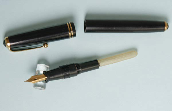 Классическая ручка из целлулоида с металлическим колпачком. Перо — открытое, сталь с иридиевым наконечником, F. Заправка - пипетка.