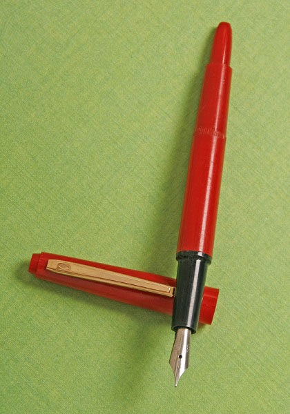 Производство Китай, 70-80гг. В наличии серый, черный и красный цвета. Перо закрытое F, сталь, заправка - пипетка, корпус - пластик. Длина в колпачке - 13,8см, длина без колпачка - 12,6см, толщина 1,1 см. Вес в колпачке - 10гр, без колпачка - 6гр.