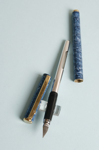 Отличная ручка из темно–синего пластика с тонким пером F на каждый день. Материалы пера — сталь, иридий. Идеально подходит для письма на пористой бумаге и заполнения квитанций мелкими буквами. Подача чернил умеренная. Годы производства: конец 80х — начало 90х гг. ХХ века.