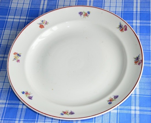 Клеймо сохранилось частично, к сожалению мне не распознать чьё производство, но точно знаю, что блюдо 30-х гг. т.к. это блюдо моей семьи. С обратной стороны выдавлена цифра "22", на фото не видно.