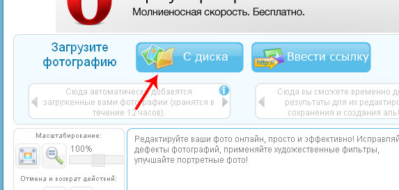 1. Находим кнопку загрузить фотографию С ДИСКА и нажимаем ее