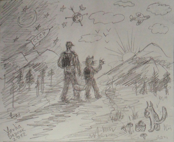 Добавлено спустя 2 дня 21 час 59 минут 34 секунды: Неожиданно приехал Барсик. Сияя комсомольским значком на заросшей шерстью широкой кошачьей груди, он, едва взглянув на меня, важно прошествовал в мой кабинет, захлопнув перед моим носом двери. Оценив ситуацию, я крикнул ему вдогонку: «Между прочим, некто назвал такие вещи “комчванством”». Вскоре из кабинета раздались удары молотка. Войдя, я увидел, как Барсик приколачивает вставленный под стекло в рамку какой-то лист типа «похвального листа» или «почетной грамоты». Барсик колотил столь сильно, что вскоре в дверях появились возмущенные соседи: «Вы так дырку в нашу квартиру пробьете!» Я молча развел руками и показал им на Барсика, - мол, с него и спрашивайте. «Он еще на кошку всё сваливает! Совсем совесть потерял!» - возмущению соседей не было границ. Когда они ушли, я сказал своему другану: - Завтра же снова начинаешь ходить отмечаться в милицию! Или я тебя отправлю в детский дом. - Да я уже приколотил! - как ни в чем ни бывало ответил тот и залез по своей дурацкой привычке прямо в валенках и буденовке под одеяло на мою кровать - отсыпаться с дороги. Ну что с такого возьмешь! Подожду, пока проснется. А как проснется - расскажет, как его приняли в комсомол. Пока Барсик спал, я обнаружил на столе кучу каких-то его бумаг. Взяв первую попавшуюся, я понял, что это черновик его заявления о вступлении в комсомол. Написано было буквально следующее: «Прашу миня принять в камсамолъ, патамушта миня в свое время не взяли туда, сколько бы я ни крестился и не божился, что не мог быть пивонеромъ патамушта у миня было трудное рабоче-крестьянское кошачье детство». (дальше неразборчиво и зачеркнуто) … И - подпись: «буденовецъ Красной Армии Барсик, он же пилотъ овиасыи страны саветовъ». «Хуже Брежнева», - подумал я. Впрочем, к косноязычию своего лучшего другана я уже привык и особо не удивлялся. Не плюй в прошлое, иначе будущее плюнет в тебя.