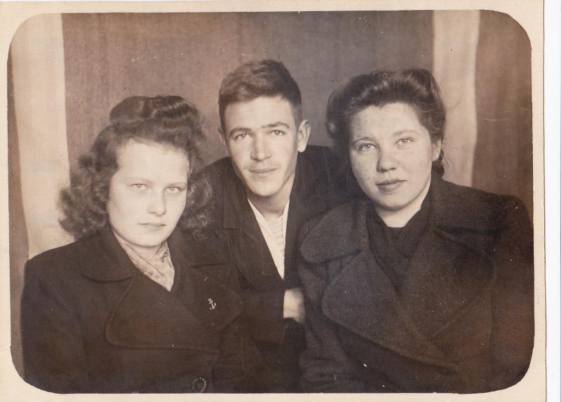 У мужчин, кстати, в моде были жилеты, это точно. Такие трикотажные, с рисунком и без. Их надевали под пиджак и просто так, мне эта мода нравится до сих пор. А у мамы были два потрясающих моё детское воображение платья. Одно розовое, газовое (мальчики понимают, что такое "платье из газа"?), другое голубое шёлковое. Их можно было носить, по моему разумению, только на бал. Даже не знаю, носила ли их мама (это ей отец привёз из Германии после войны), но я наряжалась в них, с придыханием, всё детство. Мама потом их мне подарила. И что же? Они пропали вместе с квартиркой в далёком приморском городке, куда надлежало вернуться, но судьба распорядилась иначе. А зато у меня есть такие фото из архива. Добавлено спустя 5 минут 6 секунд: И ещё, тот же 49-й год. Двоюродный брат моего отца с женой и её подругой. Тоже будущие педагоги. А воротники-то на пальто у девушек какие! А причёсочки! Дядя Миша, правда, что-то без жилета... |
