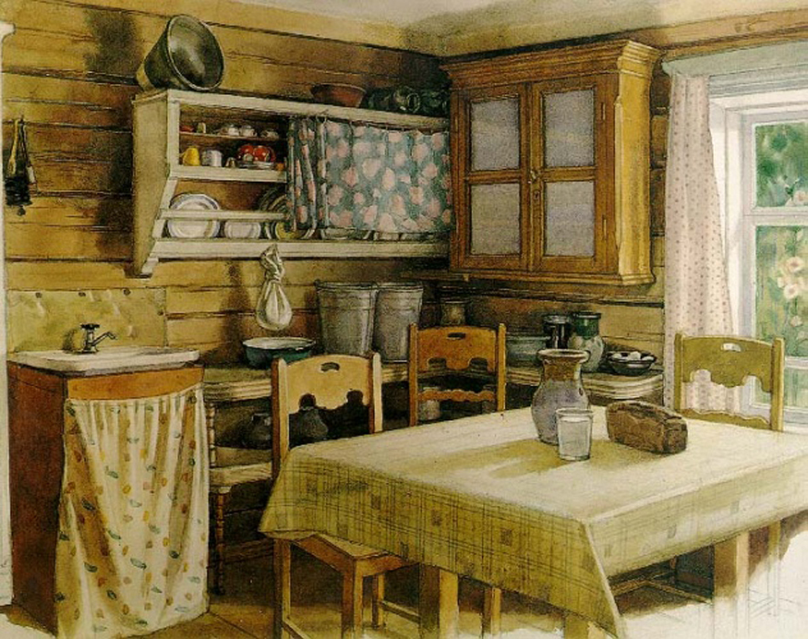 Вхожу в благоговейную тишину, чистоту, душистость. Ни тебе грязных вонючих болоток, ни рогатого велосипеда (о который все спотыкаются) в прихожей. Нежно-голубые панели, малиновая дорожка, шторы с гардинами благородного темно-шоколадного цвета. Иногда и теперь мне снится, что я живу в этой квартире или прихожу в гости. В зал даже страшновато зайти – такая там лепота расписная! Сквозь морозные узоры дорогого тюля падают на крашеный пол прихотливые тени. Кровать с никелированными спинками и шишечками на углах, кровать немыслимой высоты (столько матрасов и пуховиков было только у принцессы на горошине!), похожа на воздушный трот со взбитыми сливками: кружевные подзоры, снежно-сладкие простыни, гора подушек, которая вот-вот, кажется, обрушится (подушек тоже особых – пышных, больших, в свежих наволочках), тюлевые накидушки, думочки с вышивкой… На все это сказочное великолепие, пригорюнившись по каким-то своим сердечным причинам, взирала со стены васнецовская Аленушка (репродукция была большая, в деревянной раме) – и, наверное, жалела, что не она живет в такой светлой горнице, не она спит на этих перинах лебяжьей красоты. Над кроватью – коврик с оленями: на густой темно-синей плюшевой синеве – два царственно-золотых рогатых изюбря. А над ковром – и это было самое поразительное – голова такого же оленя! Совершенно натуральная, живая, с блестящими черно-синими глазами и корявыми рожками! К чучелу оленьей головы мы, конечно, прикасались (хотя было строго-настрого запрещено!), гладили жесткую оленью шерсть на морде, трогали колкие, в пупырышках, рога… В углу, ближе к двери - массивный платяной шкаф глубокого шоколадного цвета, полированный, с малахитово-зеленым стеклом верхней боковой дверцы. Завидный шкаф, в котором помимо шуб и платьев, хранились старые, аккуратно перевязанные ленточками открытки, пачки писем и еще какие-то невероятные фамильные ценности. За боковой узкой дверцей шкафа открывалась стопочка белоснежного, бережно сложенного постельного белья. Аккуратность этих этажей умиляла. Очень понимаю Гаева! «Многоуважаемый шкаф» Анны Семеновны был оплотом прочности, вечности, основательности. Мне он казался старинным и очень дорогим. Всю стену напротив закрывал огромный ковер в бежево-коричнево-красноватых тонах, с традиционным орнаментом. От него в комнате было немного сумеречно, уютно, тепло, покойно, и все звуки приглушались его густым ворсом. У ковровой стены, на полусерванте – массивный ящик радиолы, купленной, наверно, в конце 60х, такой ретрошарм она имела. В полусерванте стояло немного хрусталя, который, как всем известно, символ достатка в советской семье, и несколько фарфоровых статуэток. Мне особенно нравятся палевые фарфоровые львята, разлегшиеся на стеклянной полке. В углу, ближе к окну – трельяж, на нем, помимо духов «Красная Москва» и «Наташа», тоже стоят разные фарфоровые дивности. Помнятся нежные на ощупь фарфоровые поросятки и их мама-свинка (трогать нельзя, все перебьем или потеряем!). А какой там орел распростер крылья! Орел из желто-зеленого фосфора (а не фарфора!) особо почитаем, потому что волшебный: светится в темноте! Посередине зала – стол, основательный, устойчивый, покрытый либо плюшевой яркой, либо белой кружевной вязаной крючком скатертью. На нем обычно стоит хрустальная ваза с цветами по сезону – жаркам
