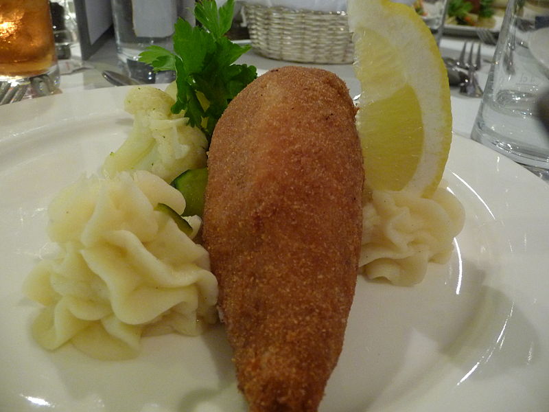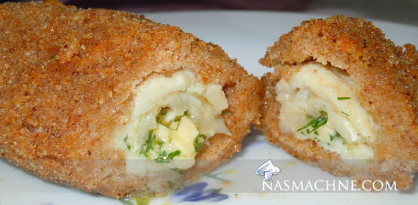 Да, пожалуйста, на здоровье... Котлета по-киевски — разновидность котлеты, представляющая собою отбитое куриное филе, в которое завёрнут кусочек холодного сливочного масла (изначально масло вбивалось в мясо кулинарным молотком, что делало вкус филе сливочным, при поточном производстве масло стали просто заворачивать). Получившаяся котлета имеет эллипсоидную форму. Запекается во фритюре, предварительно обмазывается яйцом и панируется. В масло могут добавляться тёртый сыр, грибы, зелень, яичный желток и пр. Блюдо подаётся на крутоне. В одном из концов котлеты может быть закреплена куриная косточка, на которую при подаче на стол надевается папильотка. Для приготовления котлет по-киевски необходимо: 800 граммов куриного филе; 150-200 граммов сливочного масла; два яйца; панировочные сухари; 2-3 столовые ложки муки; 50 граммов молока; зелень; соль, перец за вкусом; ]Рецепт приготовления: Приготовление котлет начинается с подготовки начинки. Для этого мягкое сливочное масло разминается вилкой, добавляется мелко посечённая зелень, соль и чёрный перец, все разминается и перемешивается вилкой к однородной массе. Потом с помощью столовой ложки делаются формы из масла в виде овала или шишечки ( по количеству котлет) и кладутся на 3-5 минут в морозильник. Это делается для того, чтобы при формировании котлет начинка из масла и зелени не расплылась. Пока масло с зеленью подмораживается, готовится куриное филе: очищается от сухожилий, косточек и аккуратно отбивается. Потом в центр отбитого филе ложится подмороженная формочка из масла с зеленью и завертывается со всех сторон куриным филе (масло должно быть плотно обвернуто мясом, не должно быть видно разрывов. Если разрывы есть, их необходимо прикрыть кусочками филе, иначе начинка при жарке может вытечь). Формируются котлетки, а потом кладутся на несколько минут в морозильник. Пока сформированные котлетки охлаждаются, в небольшой мисочке взбиваются веничком яйца с молоком. Подмороженные котлеты не должны разваливаться, но и не должны заморозиться до состояния куска льда. Вынутые из морозилки котлеты посыпаются перцем и обваливаются в муке. Потом обмакиваются в молоке с яйцом, после чего обваливаются в панировочных сухарях. Затем панировка повторяется. Это делается для того, сформировать чтобы у котлет хрустящую аппетитную корочку, которая к тому же будет предотвращать распад котлеты при жаренье. Обжаривается котлета по-киевски в фритюре 4-5 минут с каждой стороны, после чего дожаривается в духовке. Жарить котлету по-киевски необходимо непосредственно перед подачей на стол. Для приготовления, как вариант, котлеты по-киевски на куриной косточке кончик косточки вкладывается вглубь в момент формирования котлеты, в другом приготовление ничем не отличается. Котлета при этом выглядит, как куриная ножка. В начинку, кроме масла и зелени, иногда кладут яичный желток, сыр и прочее. В основном это зависит от варианта рецепта и от вкусов повара. Приятного аппетита !!! ![]() Пламя души своей, знамя страны своей. Мы пронесем через миры и века!