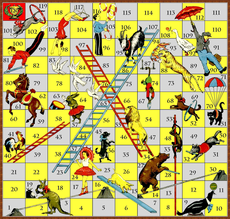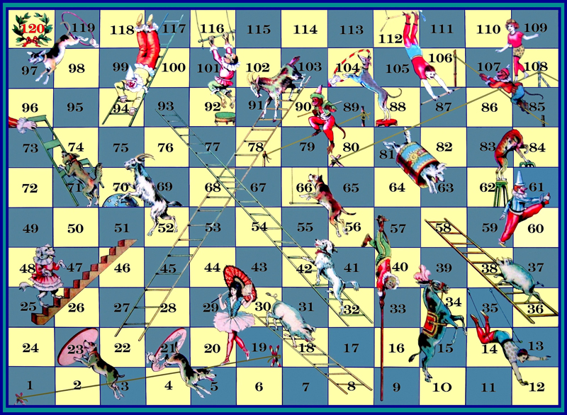 Насчет игр, то второй вариант игры "цирк" у меня есть. Само игровое поле запечатано в заводской полиэтилен, наверное что бы поле не пачкалось. А правила очень простые: рассказываю как мы играем. Бросаете кубики и двигаетесь по клеточкам по возрастанию цифр. Если попадаете на клетку с животным, то перемещаетесь туда, куда оно показывает. Например: с 3 поля на 19, с 9 на 11, с 14 на 30, с 16 на 1 ну и т.д. Когда играли в детстве самое обидное было это когда уже добираешься почти до финиша и попадаешь на 117 или 119 клетку. С них перемещаешься на 98 и 101 соответственно. Зато быстрее к финишу можно добраться, если попадешь на 96 клетку. А так же лестницы с козой и львом. Лев поднимается, коза спускается. Будет время могу описать все клетки, хотя думаю каждый сможет разобраться сам. |