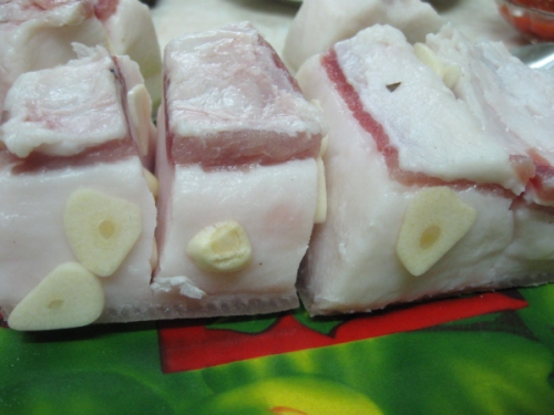Короче, берется кусок свежего сала, как-правило с прослойкой (прослойками) мяса, делаются вдоль надрезы и нашпиговывают чесноком, разрезанными пополам зубками. Сверху обсыпать кусок солью (крупной), завернуть в полотнинку или любую х/б тряпочку и положить в холодильник на несколько дней.
