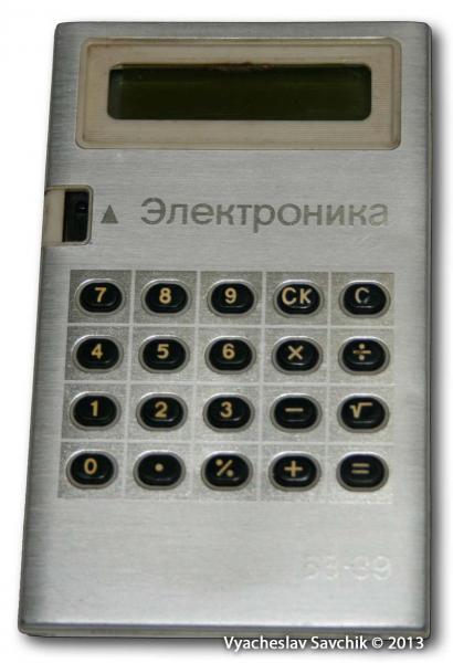 Электроника Б3-39 Внешне и функционально калькуляторы практически одинаковы, однако есть отличия. Б3-30 второй отечественный калькулятор с жидкокристаллическим индикатором был разработан в 1978 году на микросхеме К145ИП14-К. Он питался от 2 аккумуляторов типа Д-0,06 или адаптера типа Д2-11 и потреблял всего 8 мВт. Время непрерывной работы от автономного источника питания составляла 20 часов. Новая, несколько усовершенствованная, модель появилась всего лишь через год на микросхеме К145ИП14А-К и потребляла в восемь раз меньше энергии, т.е. 1 мВт. Очевидно исходя из этого, конструкторы отказались от внешнего источника питания и использовали 3 элемента типа СЦ-32. Время непрерывной работы от одного комплекта источника питания составила 800 ч. В обоих моделях была введена функция вычисления обратной величины числа. Оба калькулятора выпускались параллельно. Так в музее Б3-30 был выпущен в 1981 году, а Б3-39 в 1980. Музей отечественной вычислительной техники -