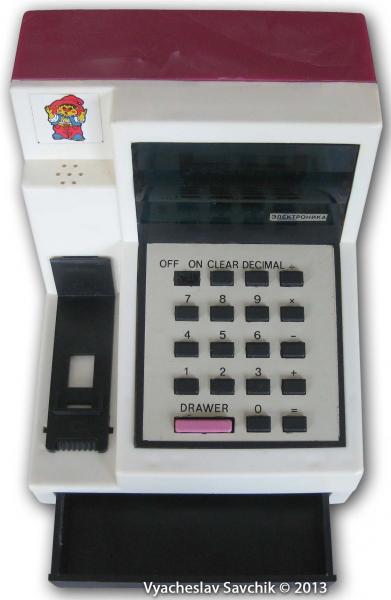 В принципе обычный калькулятор, выполняющий только четыре арифметических действия: сложение, вычитание, умножение и деление. Только выполнен в виде кассового аппарата и имеется лоток для денег, который выдвигается при нажатии на кнопку DRAWER. Все надписи на английском, а шильдик на русском - "Электроника" Музей отечественной вычислительной техники -