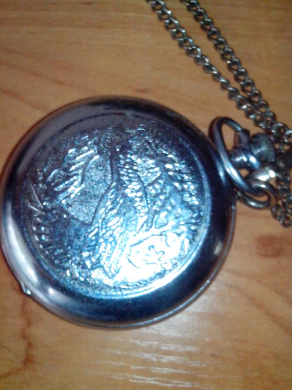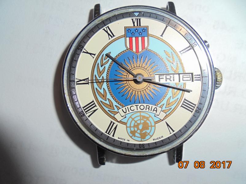 Эти часы выиграл в горбиблиотеке за ответы на вопросы по всей мировой боллитре, уж и не помню, когда. Шли недолго, потом встали, и валялись, нашёл случайно, рассмотрел и не понял, что это такое, Виктория, сделано в России, понятно, в годовщину Победы, но что за эмблема из двух флагов на 12 часов или это один флаг, может, кто-то знает? Да и попробовал первый раз вставить картинку. |