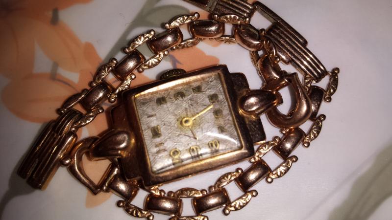К вопросу о женских часах. Подарок бабушке на свадьбу, 1947 г. До сих пор ходят, точность не ах, но для такого возвраста (не разу не чистились и не ремонтировались)! И корпус и браслет, золото 535 пробы, весом 19 гр. Вот и поверь, что плохо жили. Механизм не родной, но производитель не известен.