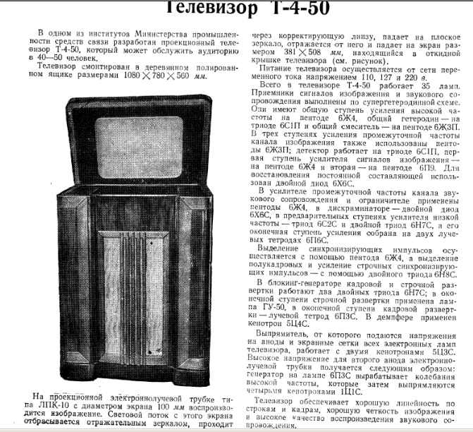 Журнал Радио №2 за 1953 год Появление ПРОЕКЦИОННОГО телевизора Последней моделью, в серии телевизоров ''Ленинград'' стал проекционный телевизор Ленинград ''Т-6''. Он был выпущен небольшой серией в середине 1951 года заводом имени Ко- зицкого. Новый телевизор Ленинград ''Т-6'' явился симбио- зом предыдущих моделей, телевизора Ленинград ''Т-2'' и Ле- нинград ''Т-3'' поэтому все технические параметры телевизо- ра - Ленинград ''Т-6'' практически соответствуют названным телевизорам. В телевизоре применён кинескоп 31ЛК1Б, а в откидыващейся верхней крышке вмонтировано слегка уве- личивавшие зеркало, в котором отражалось изображение. Акустическая система аналогична применённой в телевизо- ре Ленинград ''Т-3'' но выполнена в несколько уменьшенном варианте, что почти не сказалось на качестве звучания. Ос- новные и вспомогательные ручки для управления телевизо- ром управления находятся сверху под крышкой. При откры- вании верхней крышки, телевизор автоматически включал- ся в электрическую сеть и наоборот. Габариты проекционно- го телевизора ''Т-6'' - 1050х880х500 мм, а масса около 78 кг. В те послевоенные годы разнобой в мировых стандартах поражал воображение. Британцы, например, долгое время держались системы разложения на 405 строк. Автором этого стандарта, между прочим, выступил уроженец Пинска Исаак Шоэнберг, который служил главным инженером русской компании "Маркони" в Санкт-Петербурге, а в 1914-м эмигрировал в Англию. Французы тоже избрали свой путь, оказавшийся, впрочем, тупиковым. Изначально предполагалось, что стандартом французского телевидения станет система разложения на 1000 строк (автор идеи - Рене Бартелеми (Rene Barthelemy)). Однако Анри де Франс (Henri Georges de France, впоследствии - разработчик SECAM) предложил разложение на 819 строк при полосе сигнала 10,5 МГц. Новый стандарт заработал в 1950 г. Через 15 лет французы все же приняли стандарт 625/50, хотя и продолжая еще лет двадцать поддерживать старую систему разложения, пока устаревшие модели телевизоров окончательно не были выброшены в утиль. В США в начале 30-х годов появилась система разложения на 343 строки, созданная Зворыкиным; в 1935 году с ее использованием в Нью-Йорке началось регулярное вещание. В 1937 году Штаты перешли на стандарт 441/50, а в 1941 - на 525/60 (он же стандарт NTSC). Однако победили иные мировые стандарты - 525/60 и 625/50. Оказалось, что даже более высокая четкость (которую, в частности, демонстрировала французская система) не является гарантом успешности стандарта. Добавим лишь, что система разложения на 625 строк легла в основу двух ведущих стандартов - PAL и SECAM. Единение в цвете В 50-х также развернулась работа по внедрению цветного телевидения, автором которого еще в 1928 году выступил Зворыкин. Однако реализация идеи запоздала, чему причиной стали и военные годы. Первый коммерческий цветной телевизор удалось в 1954 году представить RCA. Модель обладала 15-дюймовым экраном. В СССР цветные телепередачи принимали телевизоры "Радуга" с вращающимся светофильтром. Но эти приемники требовали расширения спектра видеочастот, а потому были несовместимы с уже работающей системой черно-белого телевидения. По этой причине в 1956 году лаборатория Ленинградского электротехнического института связи имени М. А. Бонч-Бруевича (руководитель - П. В. Шмаков) создала систему цветного телевидения с одновременной передачей цветов. Первая передача нового ц