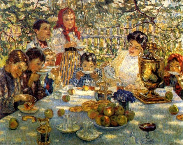 Обычай, древний на Руси. Единство, молодых и старых. Не веришь? Хоть кого спроси. Варенье, сладости, печенье, И сотами, янтарный мёд. Чай не еда, а угощение! Тут аромат от трав идёт. Говаривал один "светило". Почтенный, сельский эскулап. - Не выпил чай, какая сила! - А выпил, так совсем ослаб! От тульских братьев Баташовых*, Оглядываю самовар. Ручной работы и не новый. Кипит и чувствуется жар! Начищен, с блеском отражения, В нём вижу все черты лица. Бурлит внутри "фонтан сражения", За тонкой стенкой, без конца. На нём четырнадцать медалей. И все медали разных лет. Вы, где-нибудь, сие видали?! Не самовар, - сам раритет! Вот, оно русское наследие, Великих, тульских мастеров! Изделие, из чистой меди, Чтобы хозяин был здоров! Заварим чай из самовара, С кипящей, ключевой водой! В нём угли, отыскрятся жаром, И лягут пеплом на покой. Вот так-то вот, мой друг любезный! Я речь свою, веду о том. Из самовара чай, полезный, Когда потянет в нос дымком! А.Лихачёв |