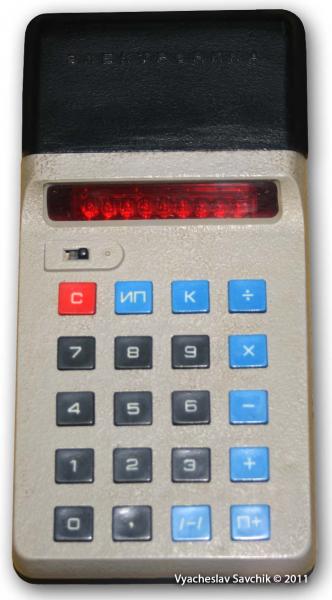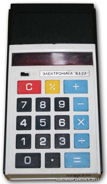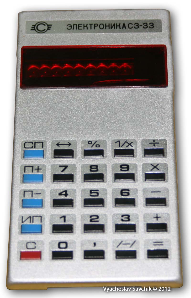 Всего 15 кнопок. Совмещены не только клавиши "+ =" и "– =", но и "х -:-" . Чтобы произвести умножение 2 на 3, надо нажать на клавиши "2" "х-:-" "3" "+ =", а чтобы разделить 2 на 3, надо нажать клавиши: "2" "х -:-" "3" "– =". Сложение и вычитание происходит аналогично калькулятору Б3-04, то есть, получение разности 2 - 3 будет вычисляться так: " 2" " += " " 3" " -= ". Начиная с этой модели калькуляторов, все простые калькуляторы Светлановского (СВЕТовые ЛАмпы НАкаливания) завода оперируют с числами с порядками до 10Е16-1, даже если на дисплей помещается восемь или двенадцать разрядов. Если результат превышает 8 или 12 разрядов (в зависимости от модели), то запятая исчезает и на дисплее появляются первые 8 или 12 разрядов числа. В 1976 году завод "Светлана" выпустил новый настольный калькулятор. Об этом и рассказали в новостях в этот день ... Калькулятор "Электроника С3-22" 1 регистр памяти. Калькулятор начал выпускаться с 1976 года и заменил более раннюю и более сложную для использования модель СЗ-07. Калькулятор "Электроника С3-33" Популярная и дешевая модель, выпущенная в замен не прижившегоя калькулятора СЗ-27. Вычисление процентов от числа, обратного числа, извлечение квадратного корня, изменение знака числа и операции с памятью. Музей отечественной вычислительной техники -