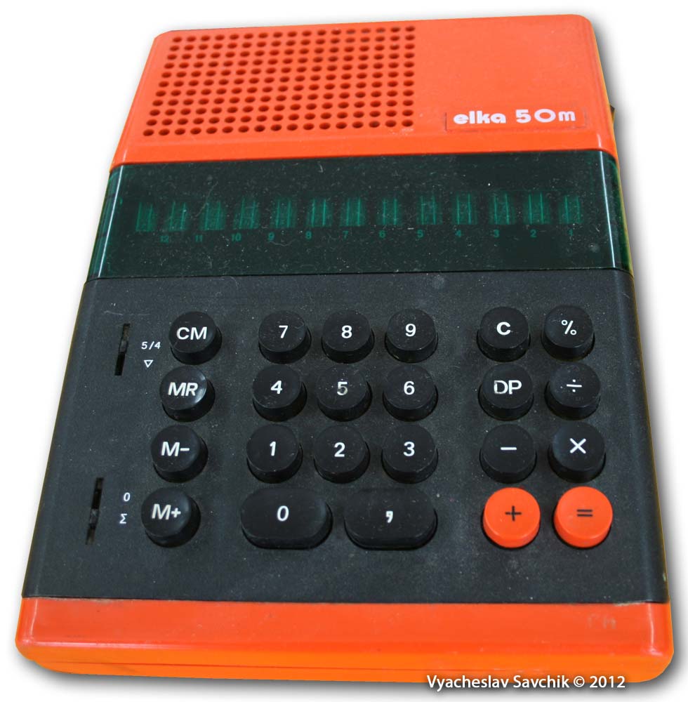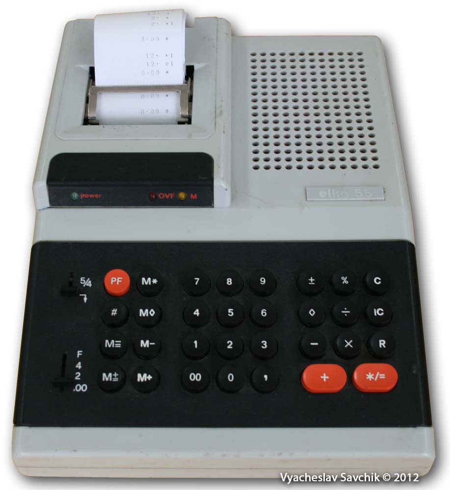 Калькулятор "elka 50M" Выпускался с 1978 года на заводе оргтехники «Силистра». При вычислениях округляет все числа до целых. Чтобы производить вычисления с запятой, до вычисления на калькуляторе надо набрать комбинацию: [DP]; [0]…[9], [,] Цифровая клавиша задаёт длину дробной части (0 — округлять до целых, запятая задаёт длину дробной части 10). Клавиатура герконовая, т.е. не имеет механических контактов и, как следствие, более качественная и долговечная в отличии настольных калькуляторов серии "Электроника". Калькулятор не имеет каких-либо особенных индикаторов статуса, для индикации состояния знака числа, состояния памяти и ошибок используется дополнительная 7-сегментный люминесцентный индикатор, при ошибке на котором загорается "С", при отрицательном числе "-", при наличии числа в памяти загорается точка. Калькулятор "elka 55" В качестве дисплея используется принтер барабанного типа. Музей отечественной вычислительной техники -