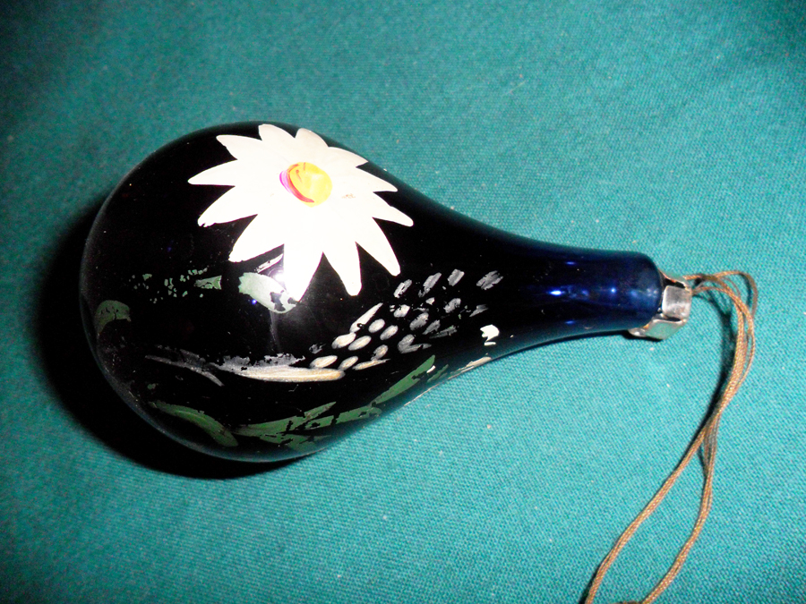 Это самая старая елочная игрушка, хранящаяся у меня. Она не из антикварного магазина, а от предков, т.е. семейная реликвия. Ее время - не позже 1950-х - начала 1960-х годов. Сделана она из темно-синего стекла, заметно более толстого, чем в игрушках более позднего времени, с ручной цветочной росписью. Сколько домашних елок в разных домах (досталась-то еще от бабки с дедом) она украсила собою за всю свою долгую жизнь! Теперь она на почетном покое в шкафу, отдельно от других елочных игрушек. Но очень редко, в знаменательные годы, я вешаю ее на елку в безопасное место. И предмет старины снова является тем, чем есть - создающим новогоднее настроение елочным украшением.