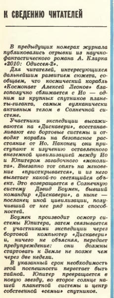 В 1984-м в журнале "Техника - молодёжи" печатался Артур Кларк, "2010: Одиссея-2". И в майском номере вместо продолжения оказалось такое: